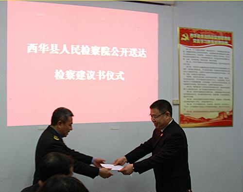 近日,西华县检察院党组书记、检察长郑清朝到该县食品药品监督管理局,针对某药房在药品经营活动中存在的问题公开送达检察建议书。