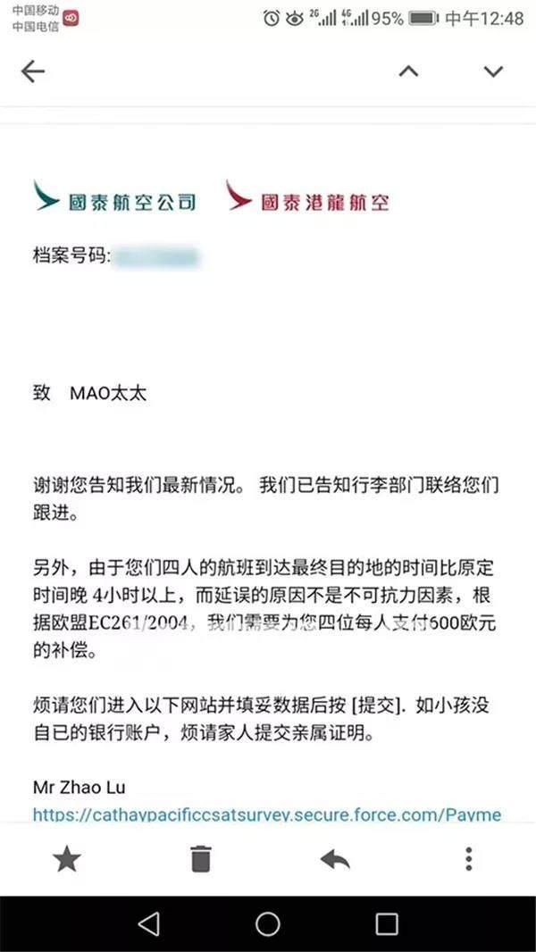 国泰航空公司很快给毛女士回了邮件: