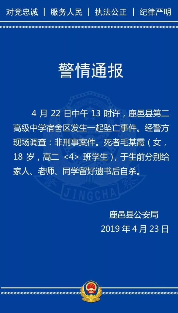 鹿邑二高18岁女生宿舍坠亡,警方通报来了!