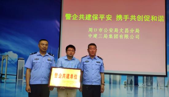 活动中,文昌分局民警代表与中建三局周口项目部代表共同为“警企共建单位”揭牌。(通讯员 张会勇)