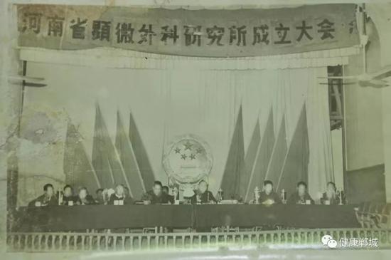 1983年河南省人民政府决定在郸城县建立河南省显微外科研究所(图为成立大会)。1984年省卫生厅拨款58.6万元在医院内建设河南省显微外科研究楼。