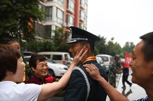 130多个日日夜夜,赵翔宇在北京阅兵村里挥汗如雨。当日下午,当他出现在家门口时,爸爸妈妈和他深情拥抱,家人们纷纷伸手抚摸着他晒得黝黑的面孔,眼中流下了泪花。赵翔宇说:“阅兵当天,我们6点左右就到了天安门广场,庆典正式开始前,我们还在长安街上进行了最后一次演练。我站在方阵中第5排21号位置,阅兵式开始时,当正步走向天安门广场的一瞬间,一种自豪感油然而生,我的眼圈泛起了泪花。”
