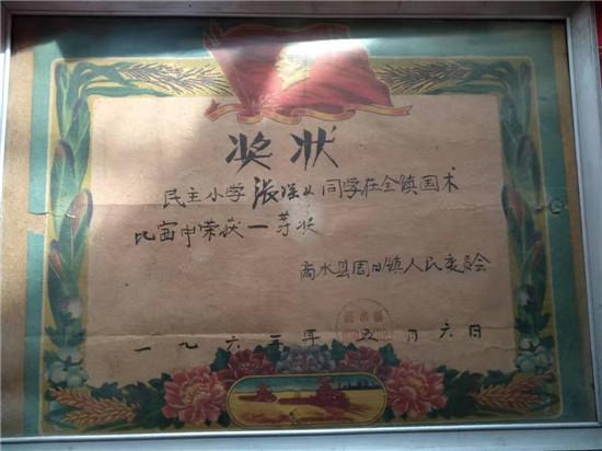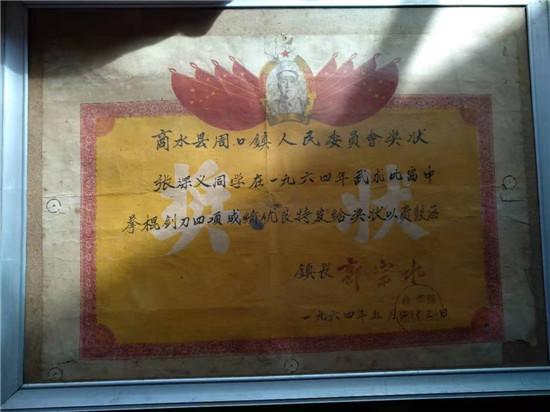 11月10日,“河南张鹤年形意拳武学研究会”微信圈里,一位名叫张深义的形意拳老拳师,闲来无事,在群里晒出他在1963年和1964年上小学时参加武术比赛时颁发的奖状。惹得群里一片沸腾。50多年前的奖状保存到现在颜色已经发黄,部分内容用毛笔字填写的,1963年奖状内容为“民主小学张深义同学在全镇国术比赛中荣获一等奖。商水县周口镇人民委员会,1963年5月5日”,另一张1964年的奖状是镇长亲自颁发的,内容为“张深义同学在1964年武术比赛中拳棍剑刀四项成绩优良,特发给奖状以资鼓励。镇长张宗水,1964年5月23日”。