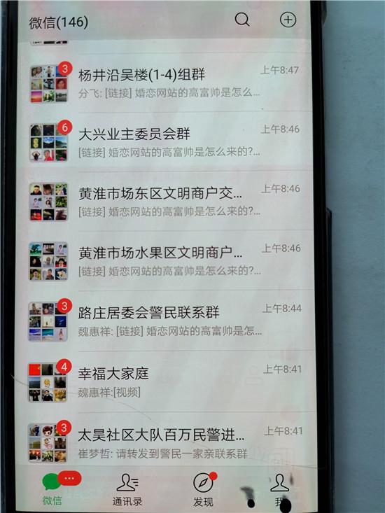 黄淮市场警务室下辖7个行政村24个自然村,常住人口21342人,行政企事业单位16家,居民小区 14个。疫情期间,为了减少面对面接处警机会,警务室通过这25个交流平台每天安排部署疫情防控工作。疫情趋于平稳后,这25个警民微信平台并没有“散伙”,警务室民警便利用这些平台宣传警务工作、发布预警信息,传授防火、防盗、防诈骗等防范知识,让辖区居民更直观的了解公安工作,通过公安机关发布的防范知识,能够及时掌握社会不良现象,对各种侵害到老百姓利益的行为作出有效的防范。居民徐先生说,警民微信群充分体现了警民一家亲,让大家切实感受到人民公安就在身边。