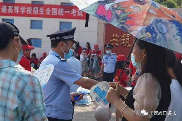 7月7日,骄阳似火,一年一度的高招因疫情而推迟到今天进行。周口城北公安分局担负辖区4个考点的安全保卫任务。当日6时30分,分局除正常值班办案的民警外,全体到一线执勤。同往年一样的是民警根据要求到岗维护安全秩序,不一样的是今年多了一项宣传电信诈骗的任务。在此之前,城北分局民警从生活经验中受到启发,想到把反诈内容印到扇子上向群众发放的办法,特定制了10000把小扇子。“孩子整天忙于备考,对这方面了解的不是很多。考试完我让他好好学学防骗知识,你们警察真是‘及时雨’,谢谢了。”陪孩子到周口一高参加考试的李女士接到扇子后十分激动。