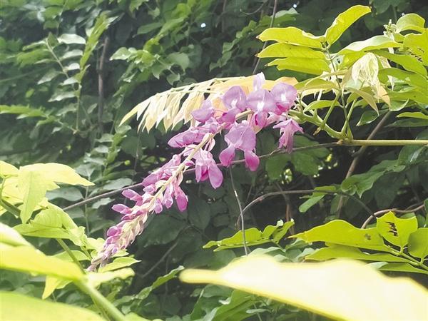 小暑已过,架上的紫藤又一次焕发青春。开始只是一两个花串在茂密的枝叶间飘忽不定,像是稀里糊涂地错过了春天,刚刚醒了过来。慢慢地,花儿多了起来,零星地散落在枝叶间,仿佛又一次回到春天。只是,春天开花时叶子还少,而此时,有葱茏的枝叶,还有第一次开花后留下的果荚。这一次,因为总体没有春天时花多,让人看到它的美,又可以忽略它的美味,紫藤花也便能安然地存在,让人感觉到它开了又开,开了还开,每一次看到,都有乍见之欢,又有久处不厌。