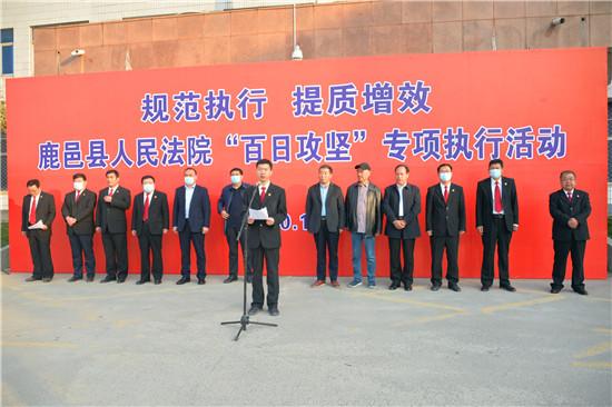 为进一步维护人民群众合法权益,规范执行、提质增效,11月10日清晨6时许,30余名执行干警、20余名法警、15名公安特警列队集合、整装待发,一场“百日攻坚”执行风暴在鹿邑法院拉开序幕。县人大常委会副主任刘景山、政法委副书记李忠振到场监督指导,三名代表委员见证执行活动。