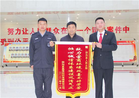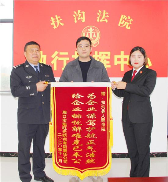 近日,周口市旭旺无纺布有限责任公司总经理带领多名工作人员来到扶沟法院,将一面鲜红的锦旗送到该院执行干警的手中,锦旗上书:“为企业保驾护航正气浩然、给企业排忧解难克己奉公”几个耀眼的金色大字。同一天,扶沟县昌茂纺织有限责任公司也送来一面写有“致力营商环境改善不辞劳苦、倾心诚信体系建设风清气正”的锦旗,感谢扶沟法院为维护民营企业合法权益、优化辖区营商环境作出的努力。