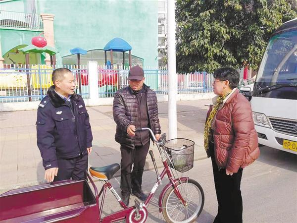 “他精神不正常,家里也没什么人。”围观的群众向民警介绍。随后,民警将该男子送到村里,把三轮车给老人送了回去(如图)。