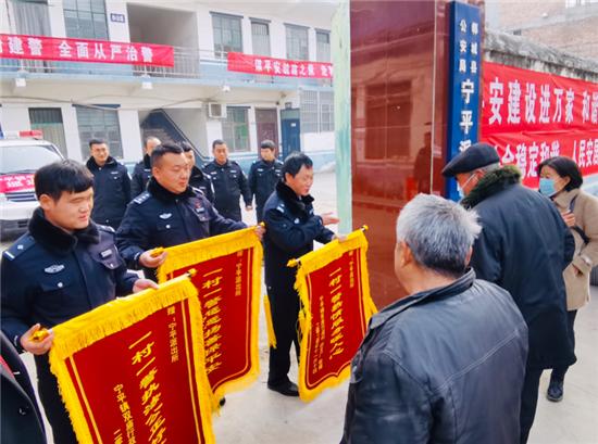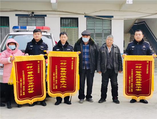 12月28日,村民田某广、田某容、周某启怀着对宁平派出所“一村一警”感激之情,把写有“‘一村一警’执法公正好村警”“‘一村一警’热情服务暖人心”“‘一村一警’惩恶扬善保平安”字样的3面锦旗送到宁平派出所,对朱群山和派出所表示感谢,说出群众心声,点赞派出所民警。②7