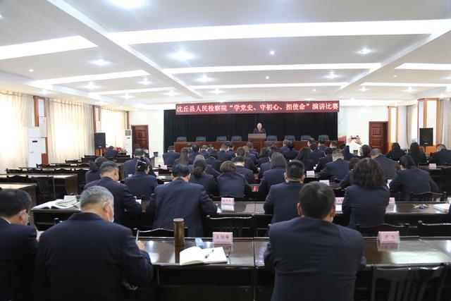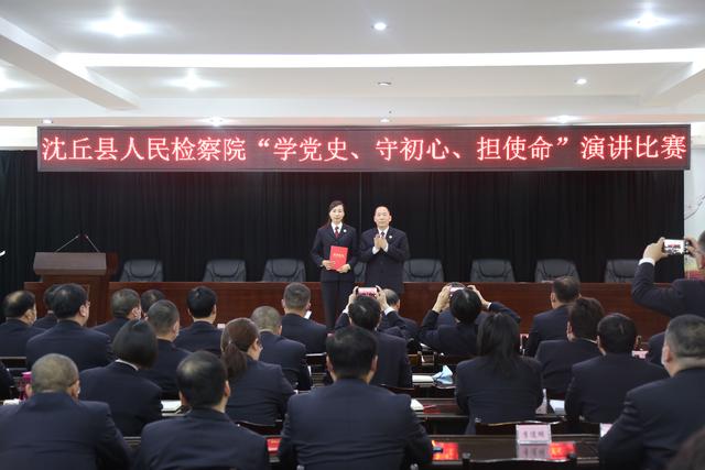 为进一步深化全体干警对政法队伍教育整顿工作重要性的认识,进一步激发干警参与教育整顿的积极性和主动性,3月23日下午,沈丘县人民检察院开展了“学党史、守初心、担使命”政法队伍教育整顿主题演讲比赛,沈丘县人民检察院党组书记、检察长李世龙带领院领导班子成员担任评委,党组副书记、副检察长作了赛前讲话,比赛由党组成员、政治部主任胡新建主持。