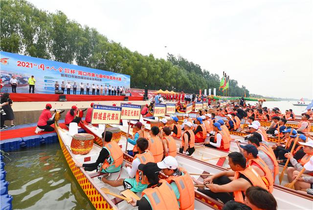 端午龙舟赛是中华民族的悠久习俗。端午节前夕,6月9日上午,由周口市人民政府主办,市教育体育局、市总工会、市直机关工委、市文明办共同承办的2021“周口人合医院颐养杯”周口市第七届中华龙舟大赛暨周口市第四届运动会龙舟比赛,在中心城区沙颍河(周口大道桥以东)开赛。在此起彼伏的呐喊声中,木浆翻飞,一艘艘龙舟飞驰竞渡,来自各县市区和市直单位的19支代表队300多名选手以赛龙舟形式迎接端午节的到来。