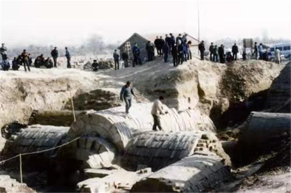 经过考古队员两个多月的辛苦清理,墓葬的形制已初步显露。这是一座带回廊的半地穴式大型多室砖石结构墓,墓室用特制的16种不同形制、不同花纹的砖、石砌筑而成。墓室平面略呈长方形,墓室东西长28.3米,南北宽18.2米,砖室占地面积515平方米,由墓道、墓门、甬道、前室、后室、左右耳室、四周回廊组成,回廊又分布有7个小室。墓葬各室均作长方形,有甬道、券门相连通,犹如一座“地下迷宫”。