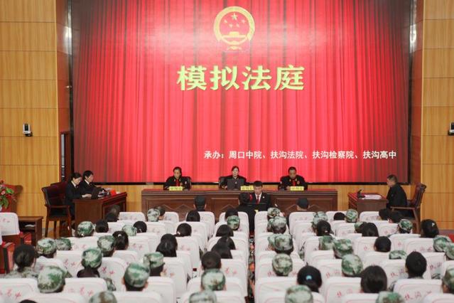 为进一步加强学校法治教育,增强学生的法律意识和法治观念,10月20日,扶沟县检察院联合扶沟县法院开展送法进校园活动,将模拟法庭搬到扶沟高中进行现场直播,该校近600名高一军训新亲身体验审判过程,“零距离”感受了法庭庭审的庄重严肃和法律的权威。