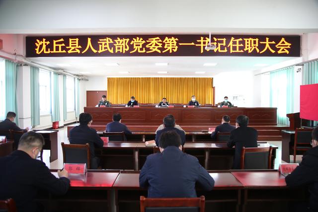 11月23日,沈丘县召开人武部党委第一书记任职宣布大会。周口军分区司令员汤维政出席会议并为田庆杰同志颁发任命书。县委书记田庆杰任县人武部党委第一书记。