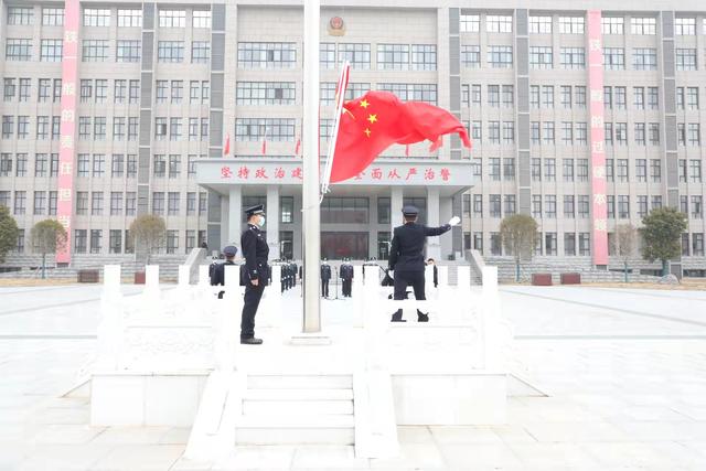 在嘹亮的国歌声中,鲜艳的五星红旗徐徐升到旗杆顶端,在空中迎风飘扬;全体人员面对警旗高举右拳重温入警誓词。