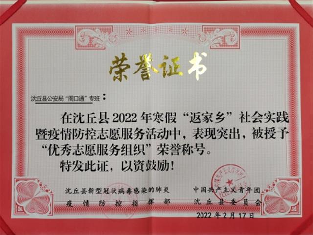 2月17日,在由沈丘县新冠疫情防控指挥部、团县委联合召开的疫情防控工作表彰大会上,县公安局疫情防控“周口通”专班获优秀志愿服务组织奖。