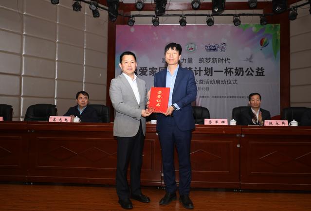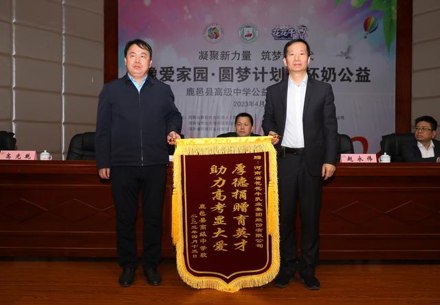 最后,高光乾代表鹿邑县高级中学向河南省花花牛乳业集团股份有限公司副总经理赵永伟赠送写有“厚德捐赠育英才,助力高考显大爱”的锦旗。苏军辉为基金会爱心大使颁发聘任证书。