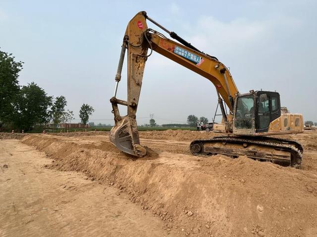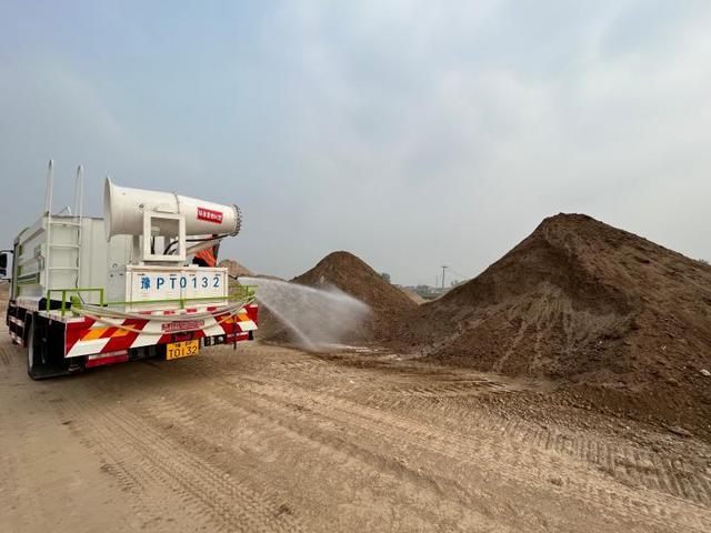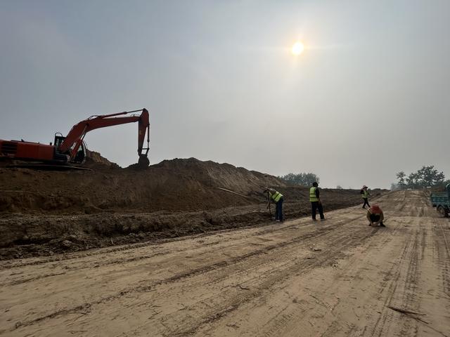 4月18日,记者在平安路东延工程施工现场看到,工程车来回穿梭作业,随处可见洒水车洒水抑尘,改善灰土含水量。在刘拱堂村东段,施工单位正进行水塘清淤工作;在大于庄至刘拱堂村段,多台挖掘机正进行码方、路槽开挖、挖除树根等作业,工作人员利用GPS定位工具进行道路放样作业,测量高程,确定里程桩,寻找正确桩号,以避免道路误差;在大于庄东段,挖掘机正进行回填作业;向前至郭庄村段,挖掘机正进行灰土拌和作业,郭庄村以东路基已经填筑完成;在大广高速分离式立交施工现场,工人们正在紧锣密鼓作业中。