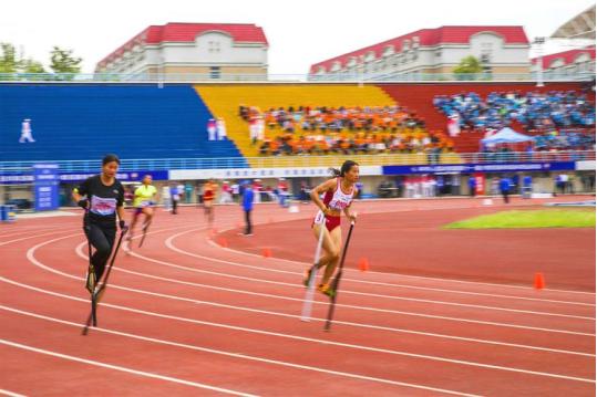高脚竞速是由运动员双手各持一杆同时脚踩杆上的脚踏蹬,在田径场上进行比赛,以在同等距离内所用时间多少决定成绩名次。高脚竞速所用的器材称为“高脚马”,高脚杆为竹、木或其他硬质材料制成,高度不限,从杆底部向上30至40厘米处加制脚踏蹬。高脚竞速设男、女100米、200米、2×200米接力,以及男、女4×100米混合接力七个竞赛项目。