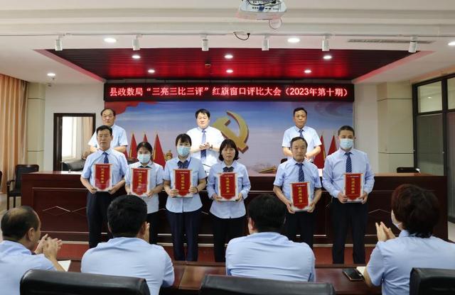 “三亮”,即党员佩戴党员徽章、所有人员挂牌上岗及穿工作装“亮身份”,窗口单位在明显位置展示服务事项和办事指南“亮职责”,所有窗口“亮承诺”,例如:用我的热心、爱心、细心、诚心换取您的称心、放心、欢心、安心。“三比”,即比服务、比纪律、比作风。“三评”,即开展日常测评、窗口互评、群众评价,由县政数局工作人员和每周从33个单位中抽取的6名窗口负责人组成互评小组,进行集中打分,再加上办事群众的满意度,评出最终结果。对综合评分前12名的窗口授予“优质服务岗”红旗,对综合评分连续5次靠后、服务质量较一般的窗口发放“基本满意岗”黄旗,对综合评分一直靠后,且群众投诉多、服务质量差的窗口悬挂“约谈提醒岗”黑旗。
