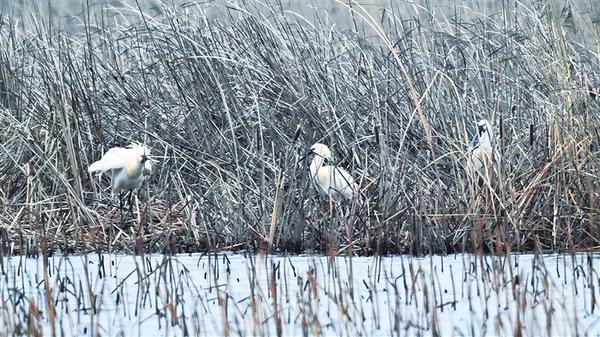 近日,北迁途中的国家二级保护动物白琵鹭现身淮阳龙湖国家湿地公园。白琵鹭的到来为这片湿地增添了灵动生机,也成为当地生态向好、人与自然和谐共生的生动写照。李然 摄影