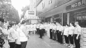 6月28日,周口市川汇区爱卫办联合河南同和堂医药有限公司在同和堂总店门前举行“清凉一夏,关爱环卫工人”捐赠仪式。当天,同和堂医药有限公司向环卫工人们捐献200件纯净水、1300条毛巾、4500盒藿香正气口服液。图为捐献物品现场。 记者 史书杰 摄