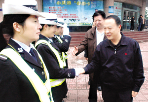 在七一路与八一路交叉口,毛超峰与正在执勤的交通民警亲切握手问好。看到6名交通协管员在这里和交警一起坚守岗位,毛超峰一一握手致意。毛超峰说,交警工作很辛苦,平时要眼观六路。良好的交通秩序是靠长期不懈的努力培养、引导出来的。毛超峰还漫步于人民商场门前广场,观看市公安局沙南分局正在举办的整治娱乐场所宣传板面。
