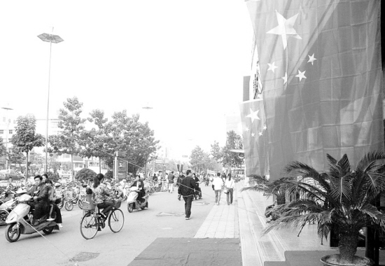 国庆节期间,我市到处洋溢着节日的喜庆氛围,居民以挂红旗、红灯笼等方式,庆祝建国59周年。 (记者 李寒 摄)