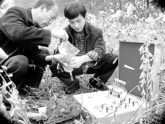 近日,我市农业科技专家深入田间地头,为农民提供科技服务,如测量耕地的肥力、指导施肥等,为明年的夏粮丰收打下基础,受到农民的欢迎。图为川汇区农林局的专家深入搬口办事处梁寨行政村的农田,为农民测量耕地肥力的情景。 (记者 梁照曾 摄)