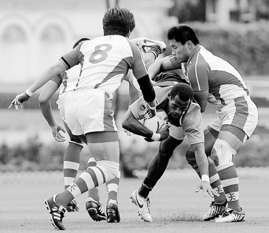 10月4日,中国男队球员在比赛中阻截对方球员的进攻。当日,在中国香港举行的2009七人橄榄球世界杯亚洲区外围赛中,中国男队以19∶12战胜马来西亚男队。 新华社记者 周磊 摄