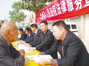 该法院针对农村经济文化水平比较落后、群众法律知识和法制意识普遍欠缺、发生纠纷后不少群众不懂得如何正确处理的情况,在宣传贯彻党的十七大精神,平安创建活动中,结合本地实际情况,开展了“法官下基层,法律进乡村”活动,让法官走进基层,让法律进入乡村,从根源上预防和减少各种社会矛盾的发生。