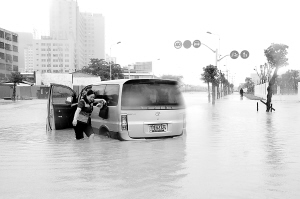 海南暴雨成灾 10月14日,海口城区部分路段内涝严重,行人和车辆艰难前行。受热带云团和冷空气的共同影响,从10月11日起海南各地普遍出现强降雨,尤其是东部、中部地区普降暴雨到大暴雨,局部地区特大暴雨。截至目前,全省超过2/3的市县出现严重灾情,共有9个市县157个村庄被淹,近5万人转移,2人遇难,1人失踪,17.5万亩农作物被淹。新华社发