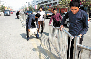 昨天,工人在八一路南段安装新栏杆。为了创建中国优秀旅游城市,迎接老子文化节,我市各有关单位积极行动,改善市容市貌,做好交通畅通等各项工作。(记者 孙安平 实习生 刘雷摄)