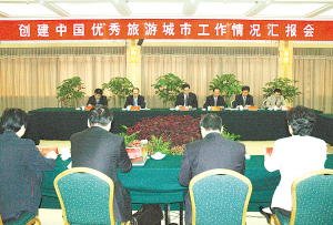 徐光在汇报周口“创优”工作时说,为全面提升周口旅游产业化水平,我市于2005年启动“创优”工作,并提出“举全市之力,聚全民之智,确保‘创优’成功”的工作目标。市委、市政府成立了由市委书记任政委、市长任指挥长的“创优”工作指挥部,从县市区抽调50多名后备干部组成7个专业小组,专心从事“创优”工作。我们根据“创优”工作检查项目多、标准高的特点,提出“紧扣标准、抓住重点、突破难点、带动全面”的创建思路,全面加强软硬件建设,三年的创建工作结出丰硕的成果。