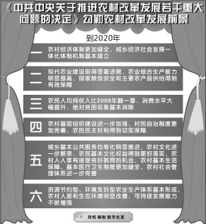 新华社北京10月20日电(记者 于文静)近日发布的《中共中央关于推进农村改革发展若干重大问题的决定》,明确了今后我国农村改革发展的指导思想、目标任务和重大原则。其中,在加快农业发展、改善农民生活、创新体制机制等方面的4个时间表,充分体现了以人为本、求真务实的精神。