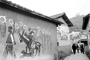10月23日,一些游客从阿着底村的民俗彩画墙旁边走过。在云南省石林彝族自治县长湖镇阿着底村,几乎村里所有屋舍临街的墙壁上都绘着以彝族“阿诗玛”叙事长诗为蓝本的民俗彩画。这些画作大部分是阿着底村的农民艺术家在农闲时创作的,主要表现彝族群众劳作、婚嫁、祭祀等方面场景。新华社发