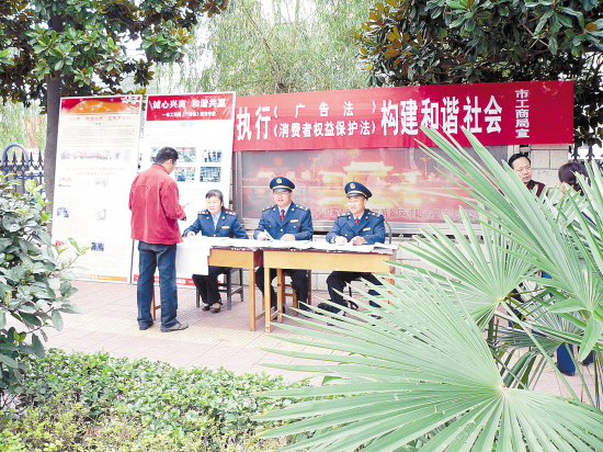 国庆节临近,市工商局组织人员走上街头,开展普法宣传。当天,他们共向群众发放材料6100余份,接受群众咨询2360多人次,现场接受投诉23人次。 王映 杨华伟 摄