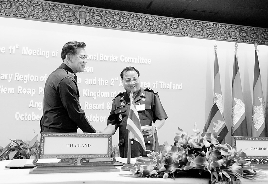 柬泰军方就领土争端签署协议 10月24日,在柬埔寨西部城市暹粒,柬埔寨第四军区司令谢默(右)与泰国第二军区司令韦伯萨·尼庞在签署协议后握手。当日,柬泰两国在暹粒举行的柬埔寨第四军区与泰国第二军区第11次地区边境委员会会议上达成协议,同意在双方争议的柏威夏寺周边地区保持最大克制以避免冲突,并确定将其他两个争议地区恢复至2008年7月15