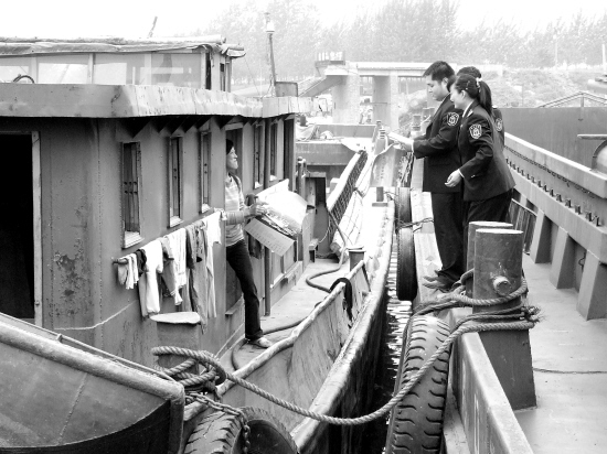 ▲为了增强船民的安全意识,着力打造平安海事、和谐海事,近日,周口市海事局工作人员把水上交通安全法律法规宣传资料送到船民手中。 (记者 孙安平 摄)
