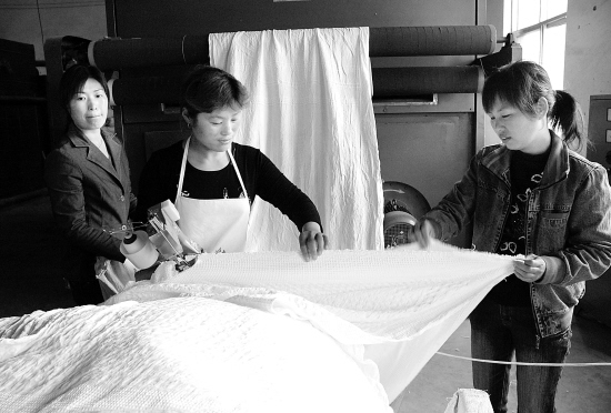 商水县是个农业大县,粮食、棉花、林业、畜产资源丰富。围绕这些优势产业,该县着力调整经济结构和转变增长方式,对纺织、畜产品加工等企业重点扶持,加快发展县域经济。图为该县纺织品加工企业的生产情景。(记者 孙安平 摄)