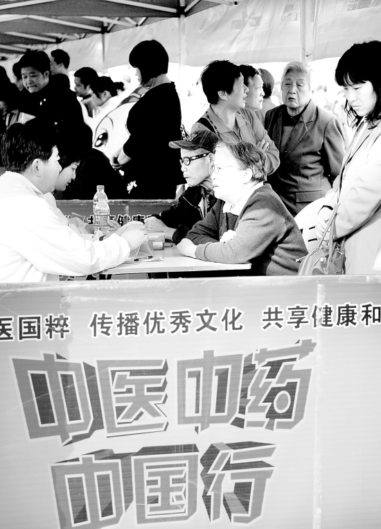 10月28日,杭州市的名中医开设义诊,吸引许多市民前来咨询和诊疗。 当日,中医药科普宣传“中医中药中国行”活动在浙江启动。这项活动包括中医专家义诊、文化展示、文体表演、图书设备捐赠、人员培训及“中医大篷车万里行”等多项内容。 新华社记者 黄深钢 摄