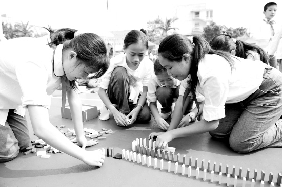 10月28日,南宁市衡阳路小学六年级学生在参加“多米诺骨牌”竞赛。当日,南宁市西乡塘区衡阳路小学举行首届科技节。科技节以小型多样、创新益智的科普活动为载体,让孩子们动脑动手,开展科技竞赛,展示学生的创新意识和科技成果。 新华社发