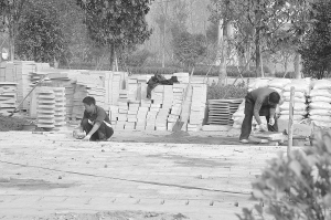 修建周口公园的工人们正在铺设公园南大门两侧的路面。根据规划,周口公园将建成集水上运动、休闲娱乐及园林景观等功能于一体的综合性公园,为市民休闲娱乐提供良好去处。(记者 王映 摄)
