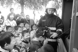 ▲昨日,市区滨河路一家幼儿园的孩子们,争先恐后地试戴防毒面具。11月9日全国消防日临近,我市公安消防支队利用各种形式向孩子们宣传消防知识,提高孩子们的安全意识和防火技能。