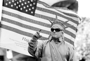 美国10月份失业率上升至6.5%,为1994年3月以来的最高点。这是一名男子装扮成自由女神像的模样,招徕游客与其合影,以赚取小费。 新华社记者 侯俊 摄