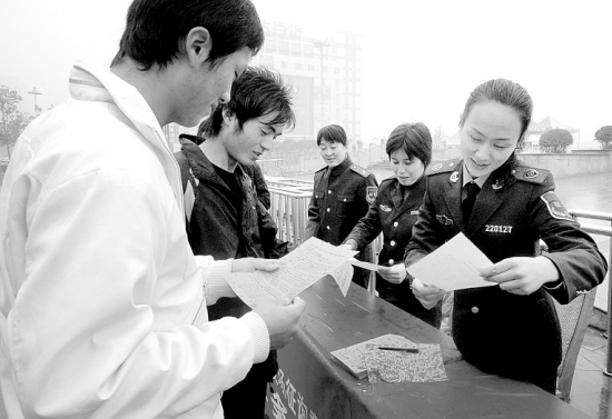 11月16日,市征稽处有关人员冒雨在五一广场设立政风行风征询意见服务台,向市民广泛征求意见和建议,并向来往路人宣传国家交通规费征收政策和有关法规。(记者 沈湛 摄)