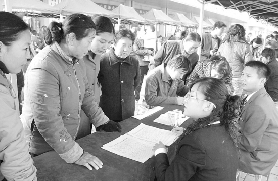 昨日,在市人力资源市场上,应聘者络绎不绝。为应对金融危机可能导致的农民工大批回流现象,我市人力资源市场每个月固定举办两场招聘会,使我市企业及时吸纳回乡农民工,保证农民工就近就业,缓解农民工就业压力。记者 李寒 摄