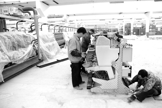 ▲日前,我市中心城区的各个在建项目正在紧锣密鼓进行中。其中鑫达纺织的技术改造工作也在抓紧实施,目前生产势头正旺,明年年底可达30万锭。图为该厂技术人员正在安装设备。(记者 孙安平 摄)