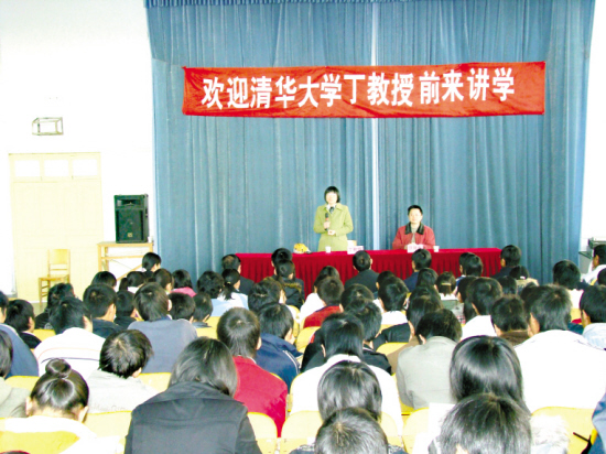 11月19日,清华大学丁青青教授来到周口恒大中学选拔自主招生苗子。期间,丁教授应邀为立志考取清华、北大的恒大学子们做了一场生动的报告,深受恒大中学广大师生的好评。图为报告会现场。 (朱刚伟 摄)